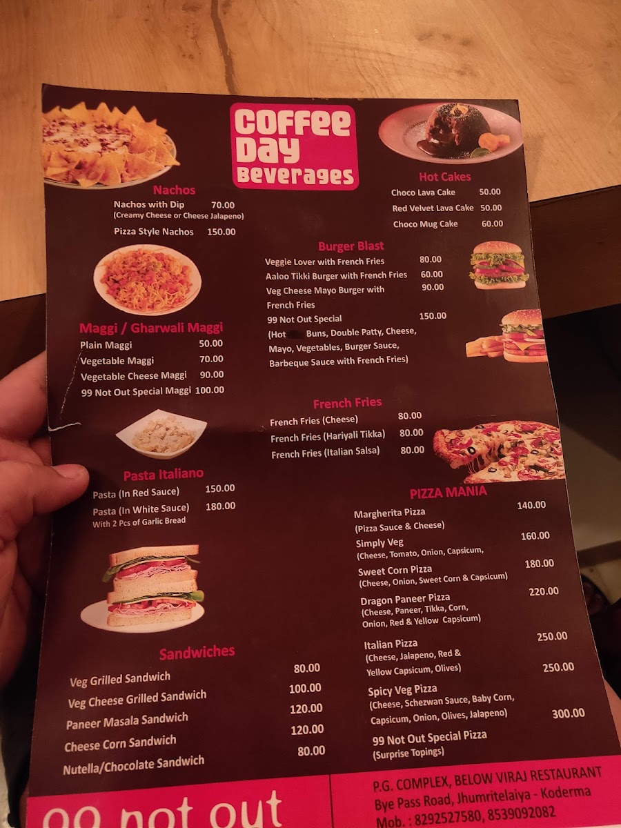 If you're on the lookout for a cozy nook to unwind and indulge in delicious culinary creations, Coffee Day Beverages by 99 Not Out in Jhumri Telaiya is your go-to destination. Nestled in the PG Complex on Bypass Rd, this café effortlessly blends a vibrant atmosphere with student-friendly pricing, making it the perfect hangout for teens and young adults.